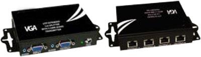 A point-to-multi point real-time 2 Port UTP VGA Splitter Extender Transmitter, VGAEXTR-2 Transmits High quality Video signal from any VGA type of player/computer to electronic display device over UTP Cat5, Cat5e, or Cat6 cable. Broadcast up-to-the-minute information real-time VGA Video to multiple remote monitors. This high resolution 2 port UTP VGA video splitter, VGAEXTR-2 drives video from one computer to 2 remote monitor screens up to 1000 feet away via inexpensive UTP cables.
